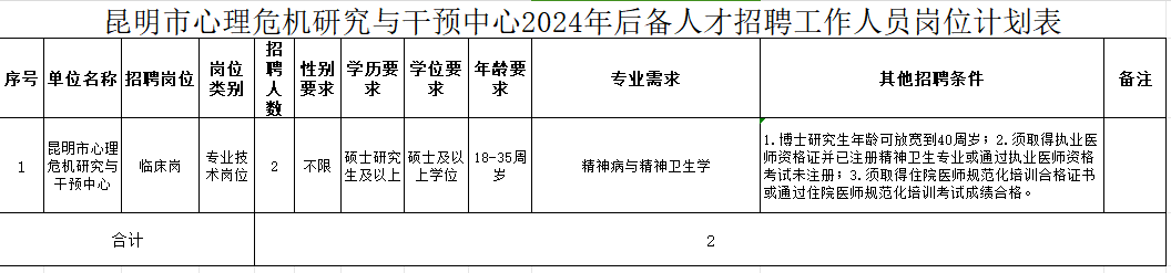 附件1昆明市心理危机研究与干预中心2024年后备人才招聘岗位计划表