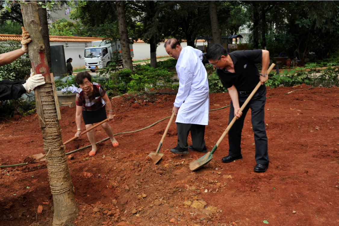 今年5月初,正值全市创建“全国文明城市”进行得如火如荼之际,院党委及时启动了拆除工作,在医院纪委的全程监督下,经过招投标程序,于5月中旬顺利完成了拆除,拆除后的占地面积约700多平方米,阮院长数次带领班子成员及总务科人员实地勘察,对绿化植树工作提出了许多宝贵意见建议,院党政领导班子集体也多次就绿化方案进行了论证确定。6月上旬,在陈志祥副院长的倡议下,总务、保卫科党支部书记谢道洪把此次义务植树活动列为本支部“党员固定活动日”来开展,在整个活动中,支部所辖科室的职工也自愿参与到义务挖掘树坑的工作中,他们顶着烈日、冒着酷暑连续奋战数日,先后挖坑40多个。随后,陈志祥副院长带领总务科负责人先后辗转宜良、双龙乡、花箐等地采购腐殖土、各种乔木46棵。