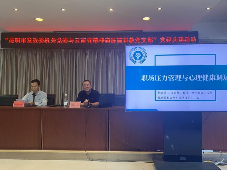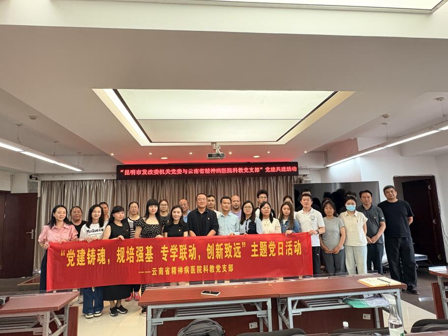 2025年9月17日,云南省精神病医院科教党支部与昆明市发展和改革委员会机关党委联合开展“党建铸魂,规培强基,专学联动,创新致远”主题党日活动。此次活动以心理健康服务为纽带,创新探索“党建+专业”融合模式,充分发挥科教党支部医学教育优势,支部组织了规培、专硕身份的党员深度参与实践服务,为昆明市发改委干部职工送上心理健康“及时雨”,为干部职工心理健康注入“红色动能”。