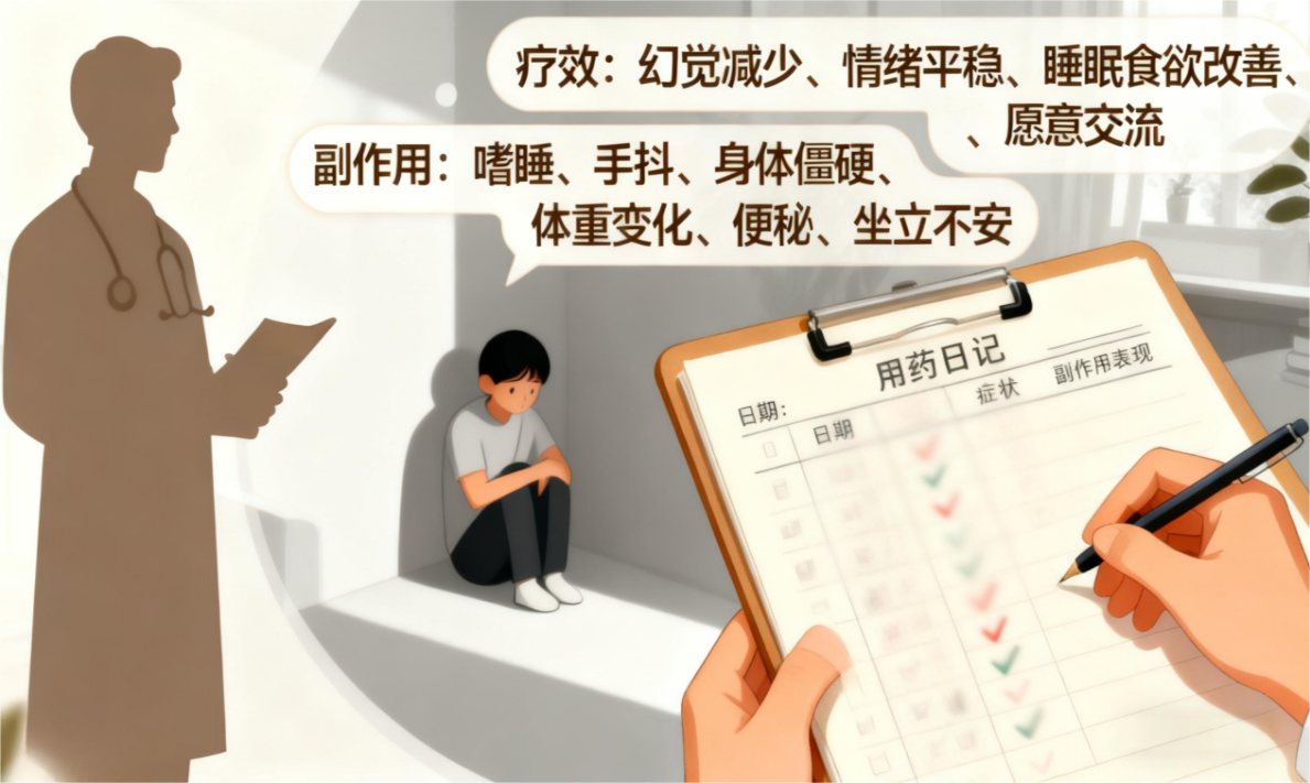 · 副作用:是否出现明显的嗜睡、手抖、身体僵硬、体重快速增加、便秘、坐立不安?