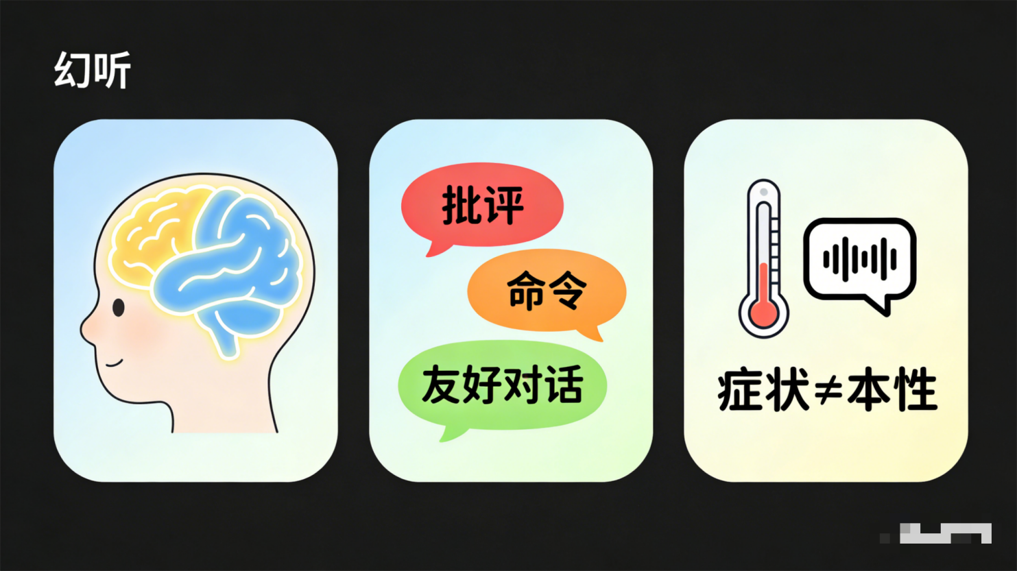 · 幻听的内容多种多样。 可能是批评、辱骂、命令,也可能是中性或友好的对话。最具危险性的是“命令性幻听”,它可能指令患者伤害自己或他人。