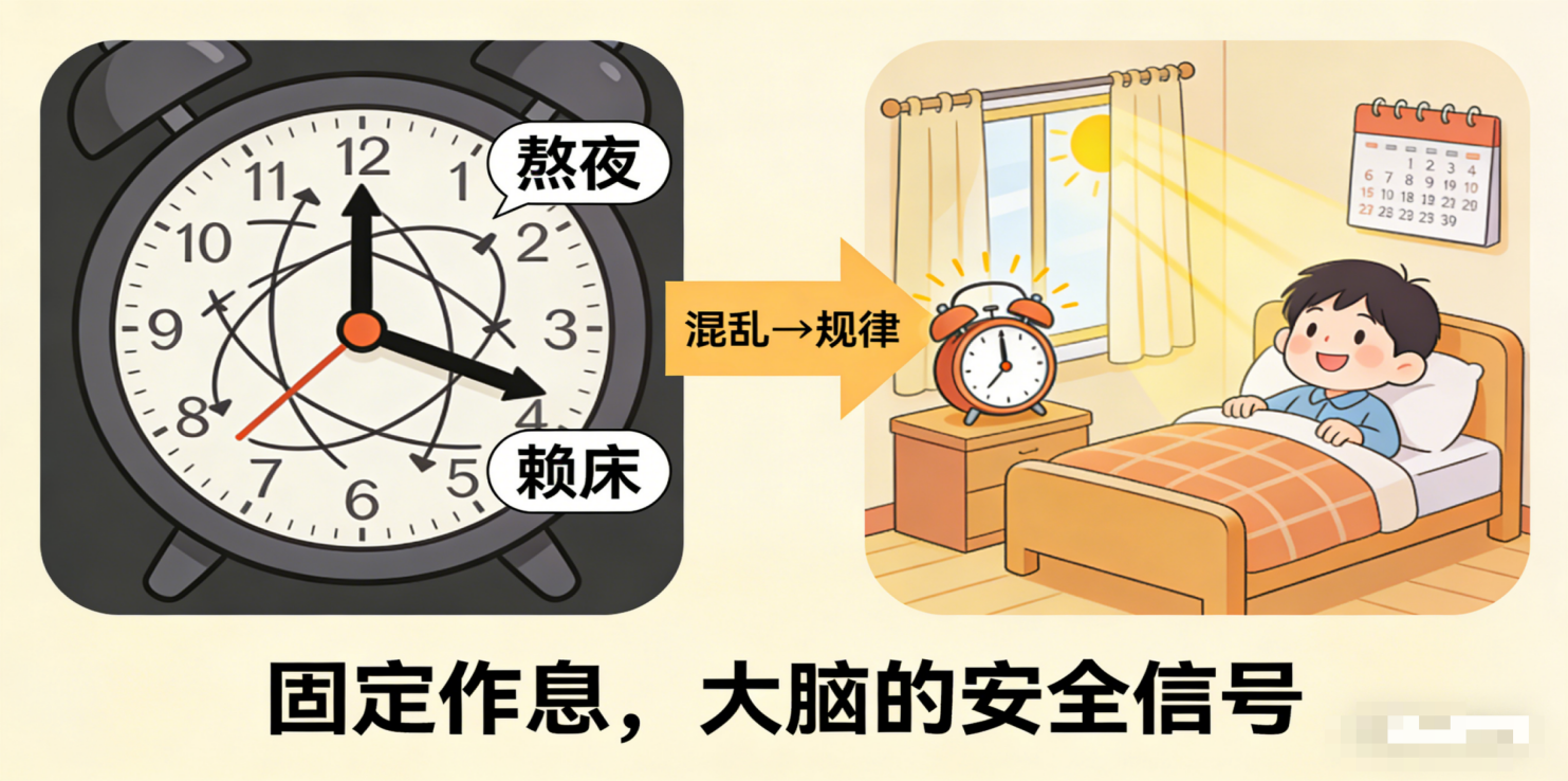 为什么重要?想象一下,如果每天起床和睡觉的时间都乱七八糟,我们身体的“内部时钟”就会混乱。这个时钟管理着我们的情绪、精力和激素。规律的作息,是给大脑最基础的安全信号。