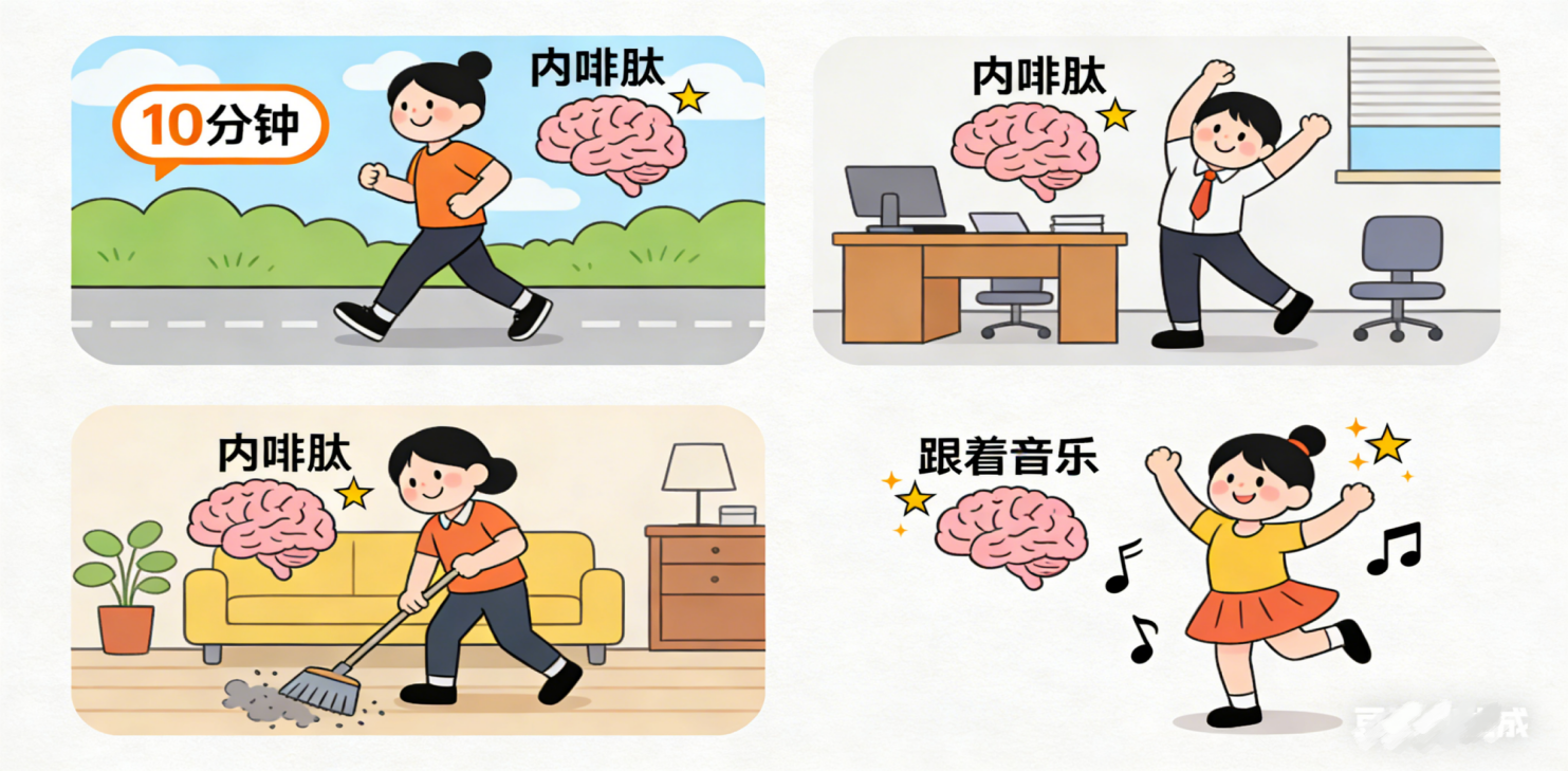为什么重要?运动是最好的“天然抗抑郁药”之一。它能释放“内啡肽”,这是一种让你感觉良好的化学物质。更重要的是,它能帮助消耗掉因压力产生的多余能量。