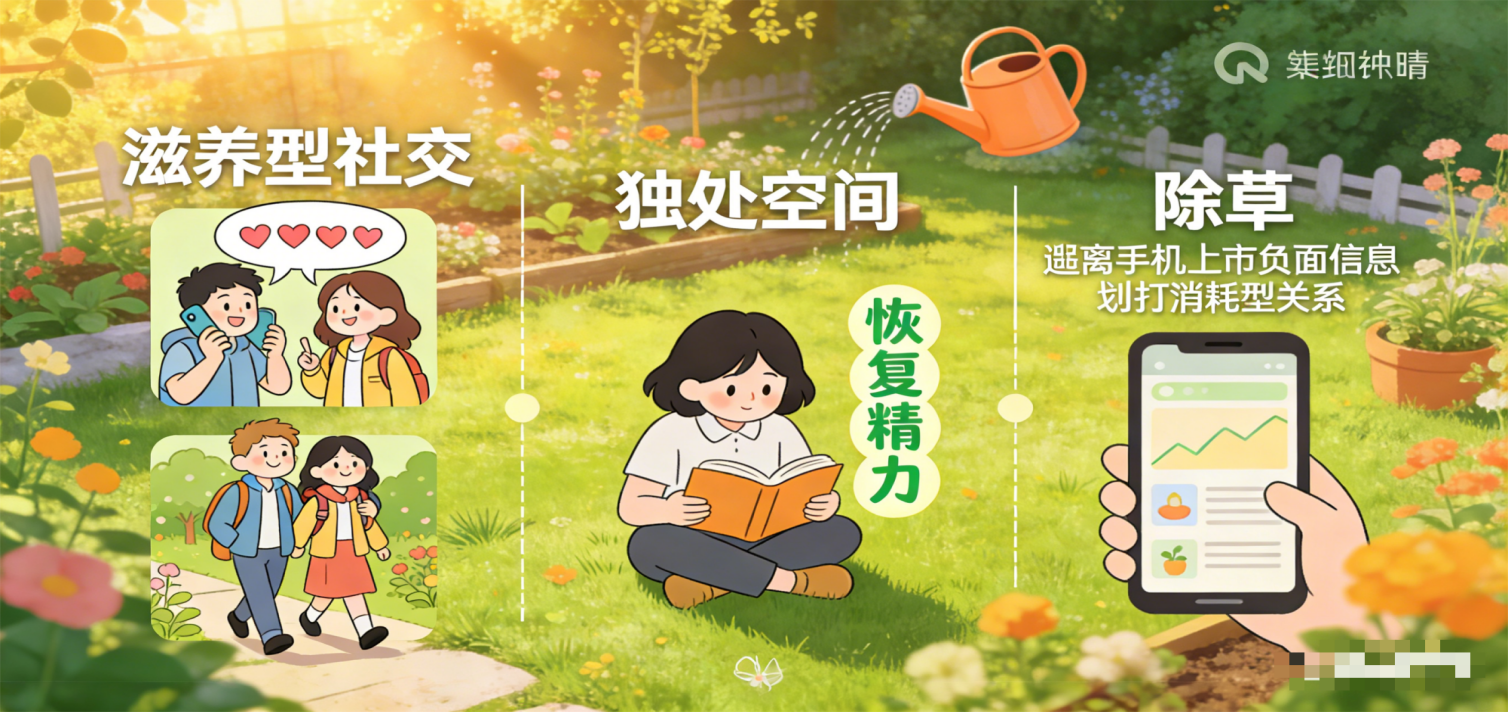 也要学会“给花园除草”:如果某些关系或信息让你持续感到消耗,允许自己暂时远离。适度的独处是恢复精力的关键。