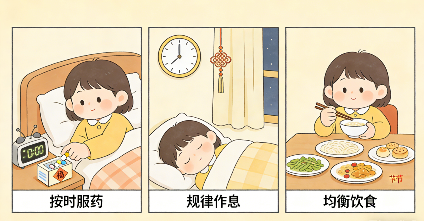 按时服药:节日期间最容易忘记服药或自行调整剂量。请设置提醒,确保药物按时按量服用,切勿因“过年吃药不吉利”等观念中断治疗。