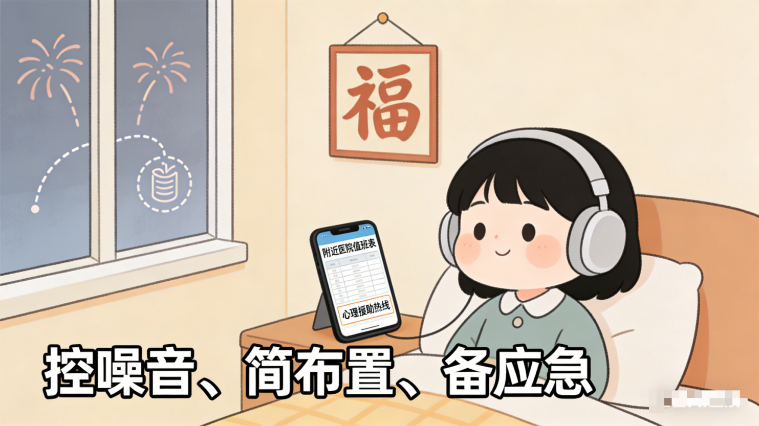 控制噪音:鞭炮声、喧闹声可能引发焦虑,可准备降噪耳机或在安静时段外出