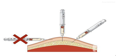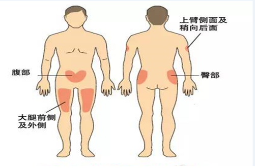3. 注射部位:胰岛素常用的注射部位是下腹部(距肚脐5cm之外)、上臂上侧及外侧、大腿前侧及外侧和臀部,为防止脂肪萎缩及硬结的出现,您应规律地轮换注射部位,每次注射间距在2cm以上,同时避免在已形成斑痕或硬结的部位注射;