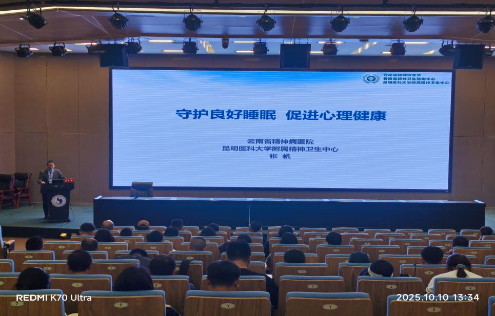 2025年10月10日下午,恰逢第34个“世界精神卫生日”,主题为“人人享有心理健康服务”。在这个关注心理健康的重要节点,云南省精神病医院睡眠医学中心张帆主任受邀走进云南艺术学院,为该校各二级学院辅导员、班主任及专职教师等近一百人带来一场《守护良好睡眠,促进心理健康》专题讲座,以专业视角解锁“睡眠”与“心理”的深层关联,为高校教育工作者送上科学实用的心灵守护指南。