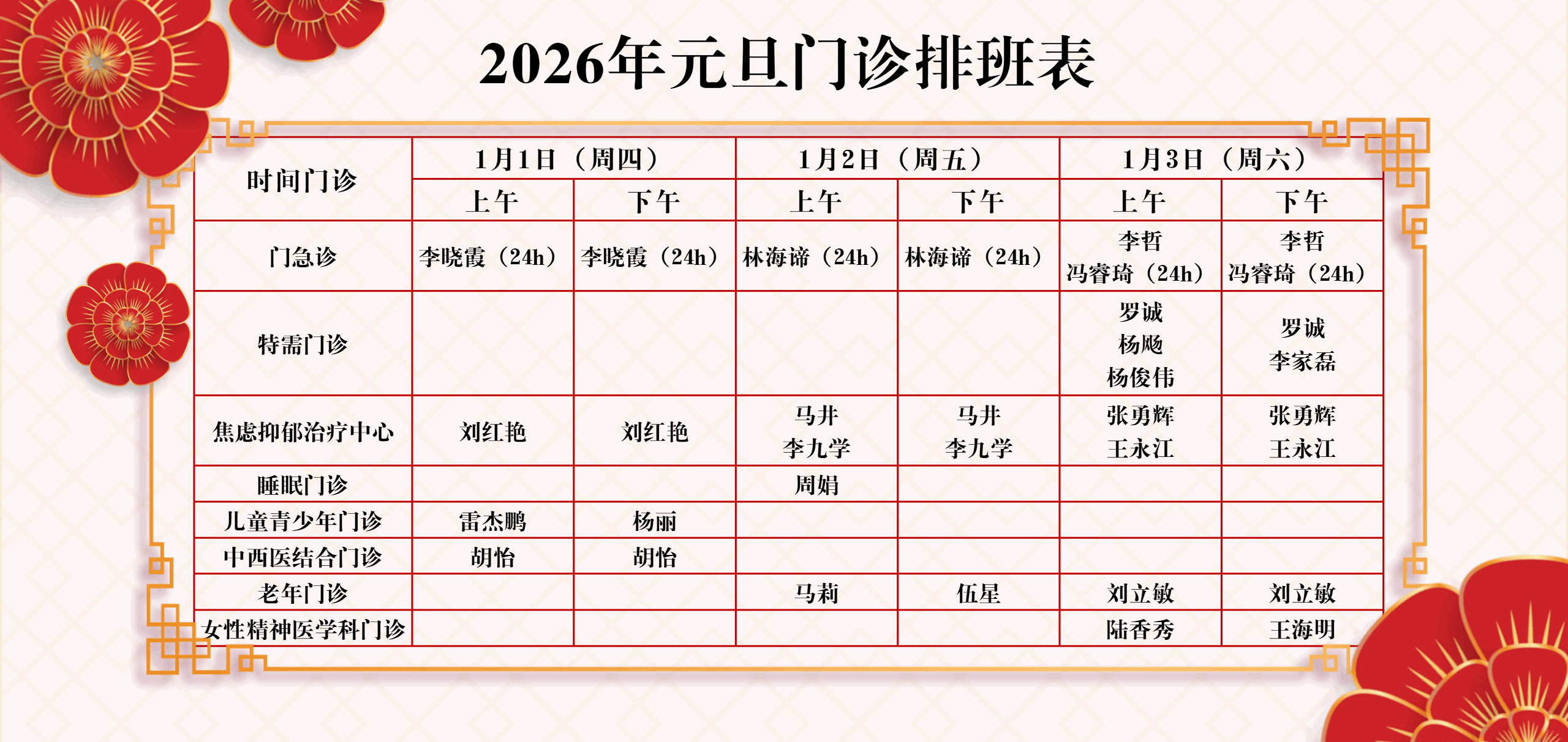 为保障您假期的就诊需求,我院2026年元旦假期(1月1日-3日)门诊排班安排如下: