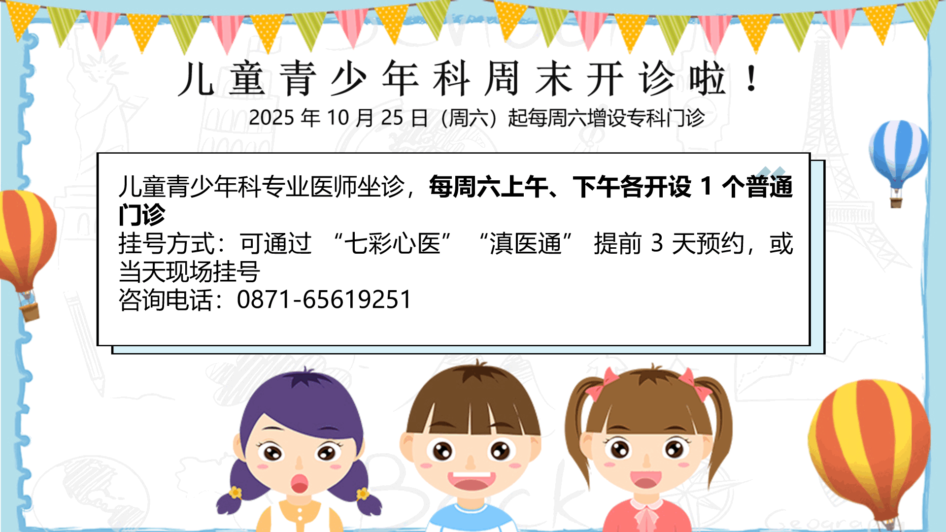 请各位家长根据孩子的需求,合理选择就诊时间。就诊人员可通过七彩心医、滇医通提前三天预约挂号或当天现场挂号,有疑问可拨打儿童青少年科电话(0871-65619251)咨询。