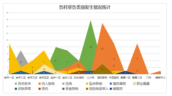 各科室集中发生的不良事件也体现出各个科室工作的特点及差别,其中自伤自杀在儿少科最为常见,主要以非自杀性自伤多见,尤其是上半年儿少科上报自伤自杀12例,经过科室有针对性的分析讨论及整改,下半年下降到4例,改善率达到66.66%。而压疮集中发生在老年科及酒依赖科,其中老年科二区压疮发生从上半年6例下降到下半年的1例,改善率达到83.33%。跌倒坠床集中发生在老年科,其中老年科四区从上半年5例下降到下半年的2例,改善率达到60%。职业暴露发生在带教任务比较繁重的老年科四区及临床一区,经过上半年针对性的职业暴露不良事件分析及讨论整改,下半年未在发生职业暴露,下半年改善率达到100%。伤人毁物集中发生在酒依赖科、中西医科、妇女病科、康复二区。