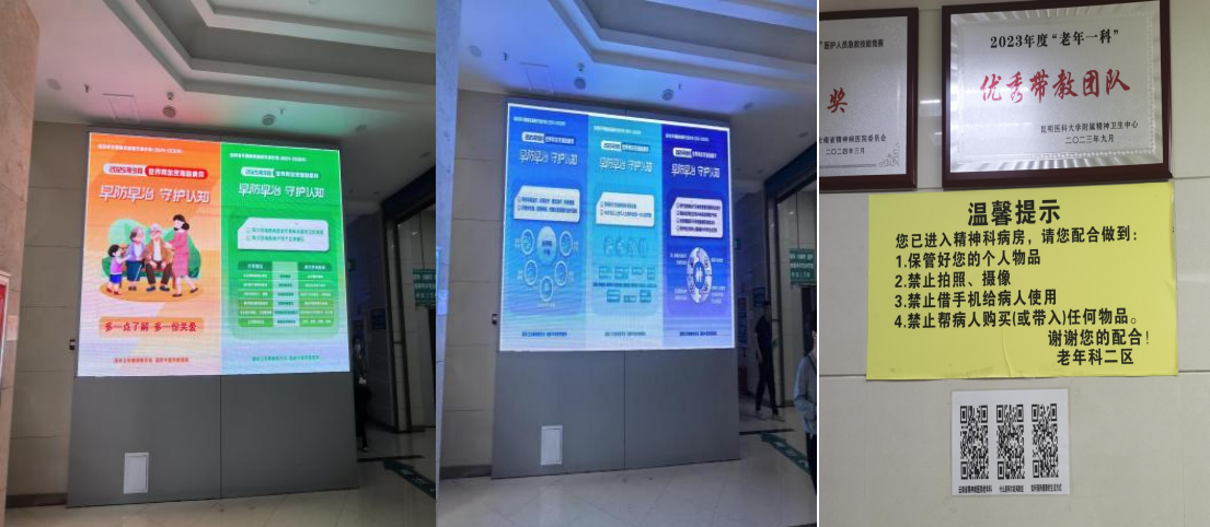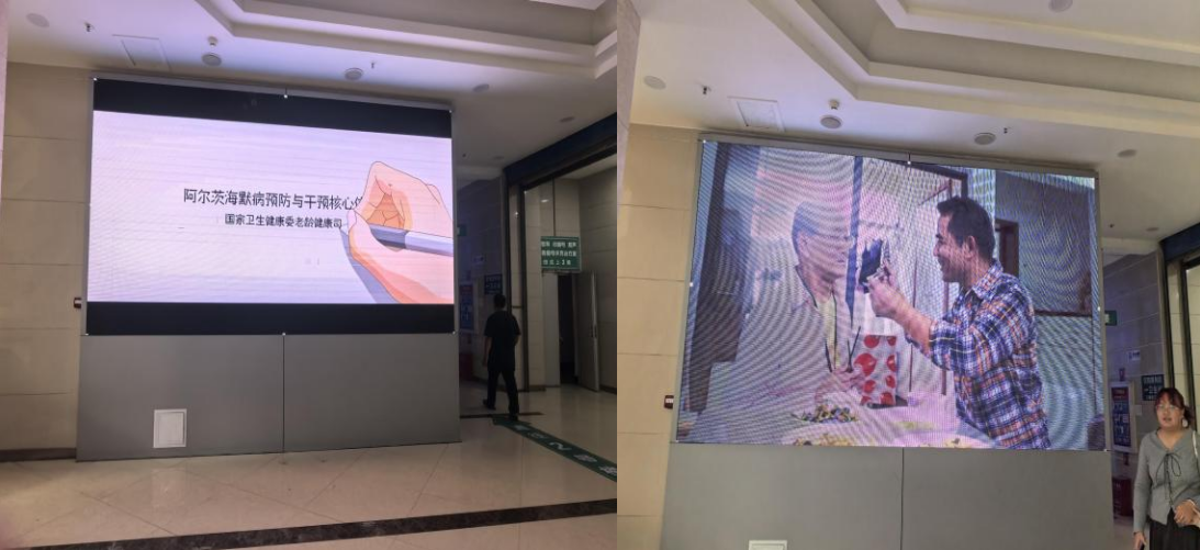 我院在电子显示大屏幕滚动播放了相关内容宣传片,设立阿尔茨海默病健康知识二维码,患者及家属可扫码了解相关知识。