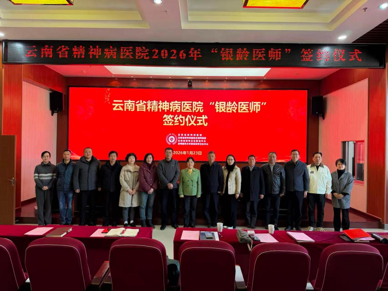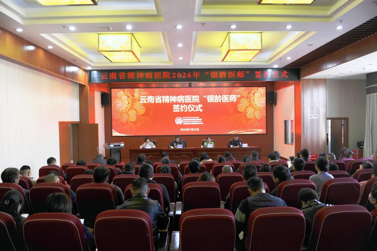 2026年1月23日上午,云南省精神病医院银铃医师签约仪式在医院隆重举行。医院党委书记主持会议,昆明市卫生健康委相关领导出席会议,医院领导班子成员、各党支部书记、中层管理人员、护理管理人员及重要科研项目负责人参加仪式。